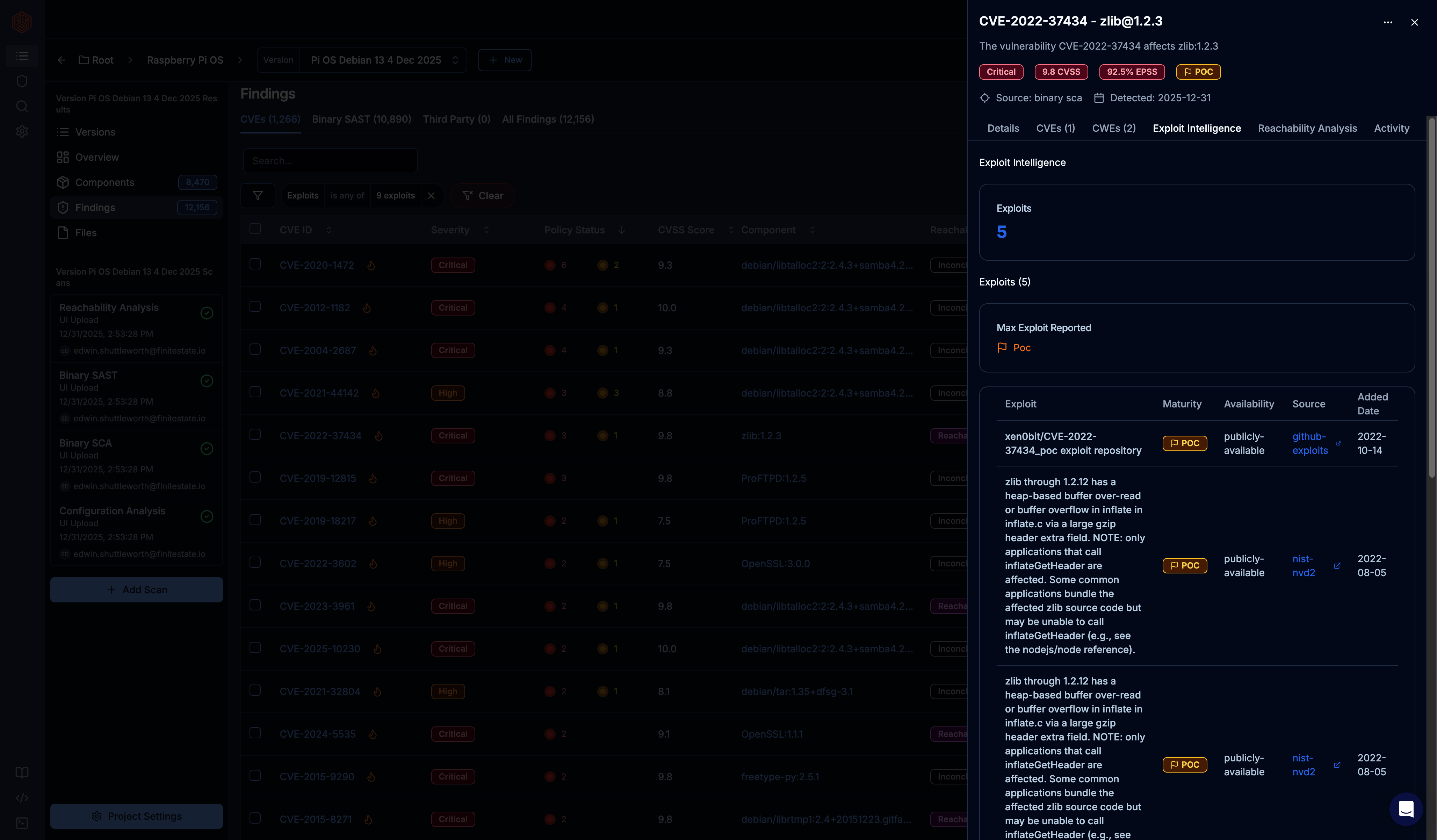 Screenshots of the Finite State platform, including SBOM generation, vulnerability prioritization, and compliance reporting outputs.